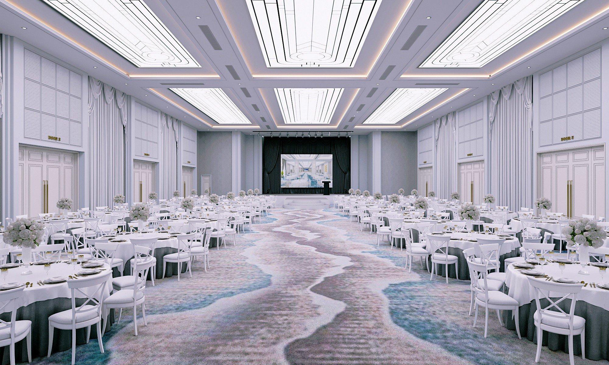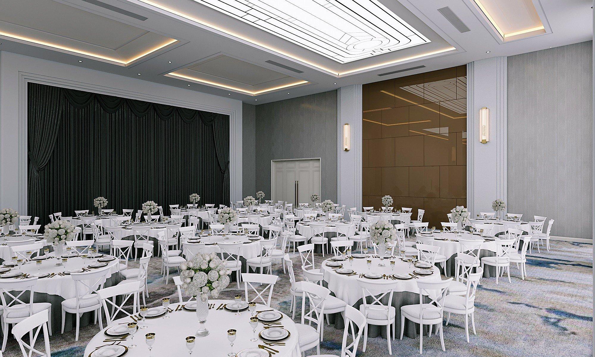 The Ballroom at Nam Cuong Hotel embodies Modern Classic elegance, offering a luxurious setting for conferences, weddings, and grand corporate events.