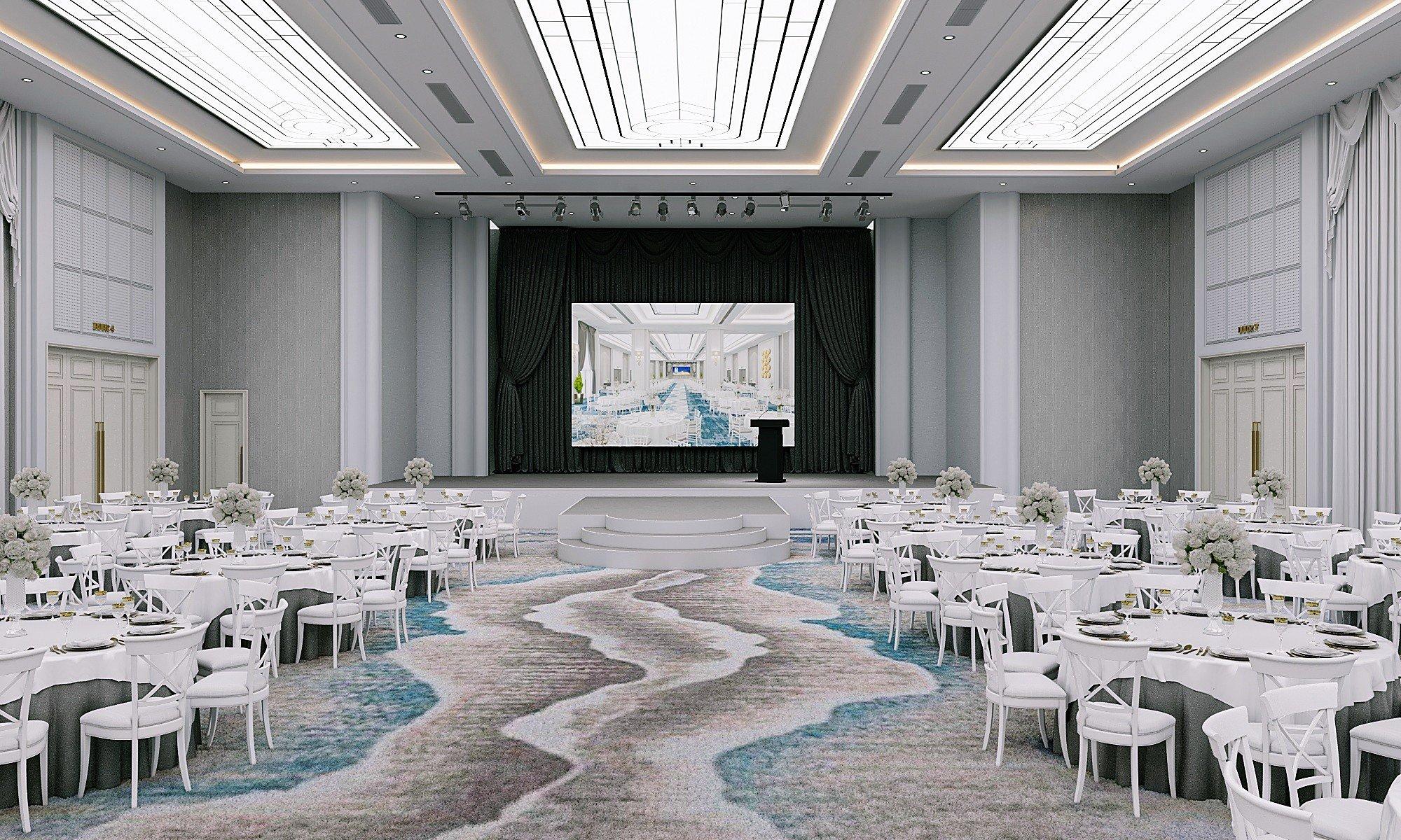 Không gian nổi bật với gam màu trắng – xám nhã nhặn, hệ đèn trần nghệ thuật ánh sáng vàng dịu kết hợp cùng trần cao và rèm nhung sang trọng, tạo cảm giác rộng mở và tinh tế. Họa tiết thảm sàn mô phỏng dòng chảy mềm mại làm điểm nhấn, giúp không gian thêm phần hiện đại và sinh động.