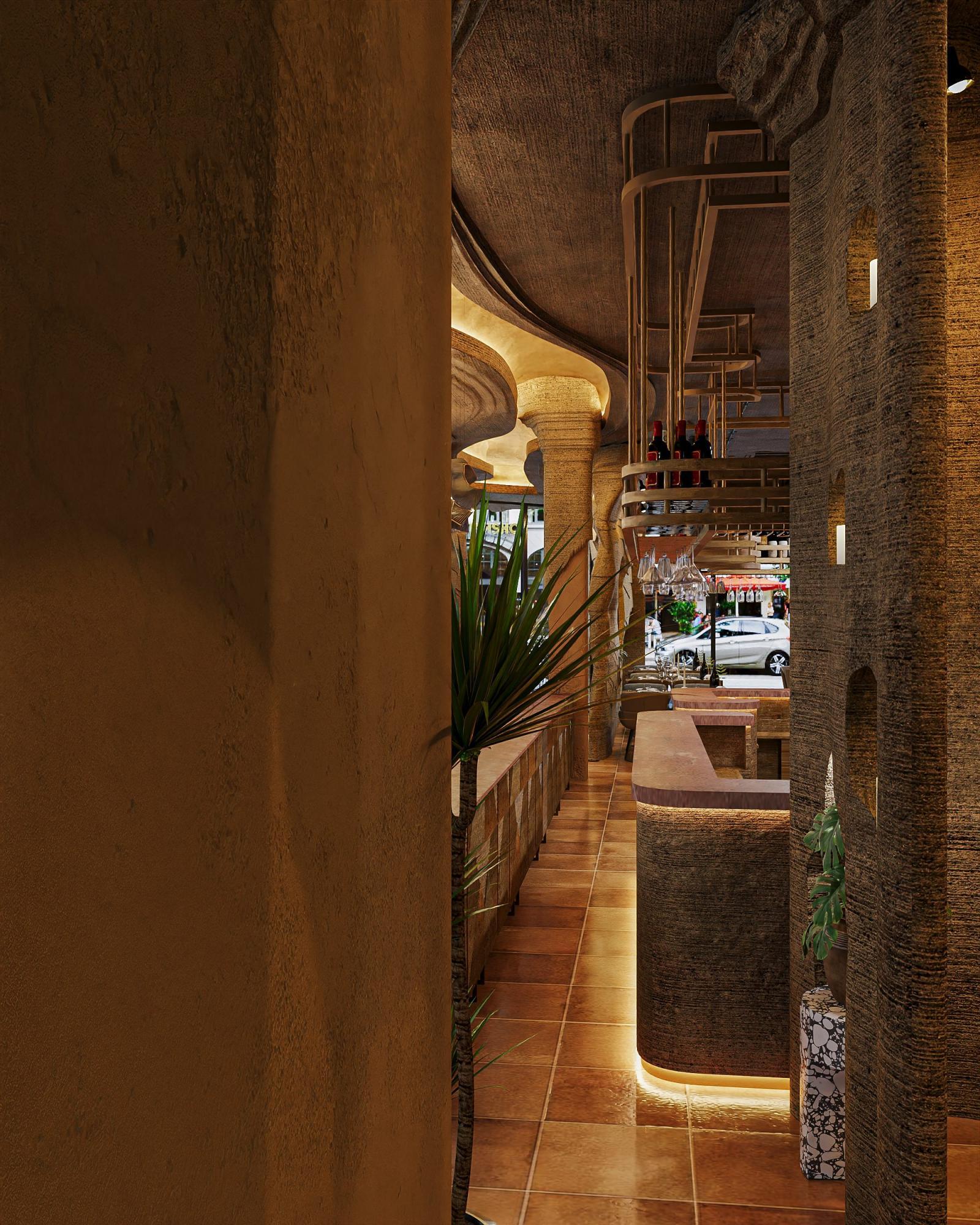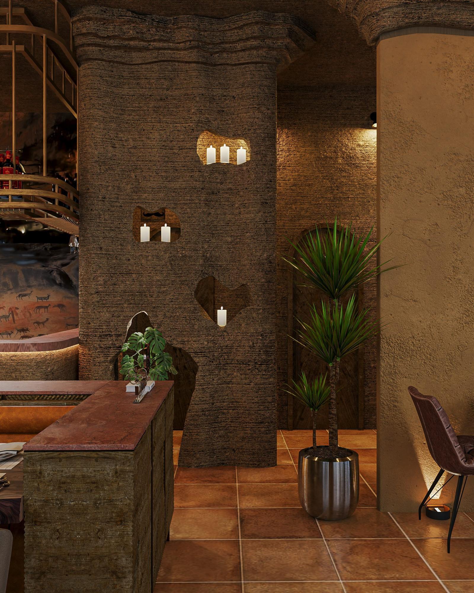 Không gian được bao phủ bởi đường cong mềm mại của vách đất thô, hệ trần uốn lượn như những dải nham thạch tự nhiên, cùng ánh sáng vàng ấm len lỏi qua từng hốc nến và chi tiết gỗ mộc. Từng chi tiết nội thất được xử lý tinh tế bằng vật liệu tự nhiên như đá sa thạch, gỗ, da, kim loại – tạo nên cảm giác chân thực, gần gũi nhưng không kém phần sang trọng.